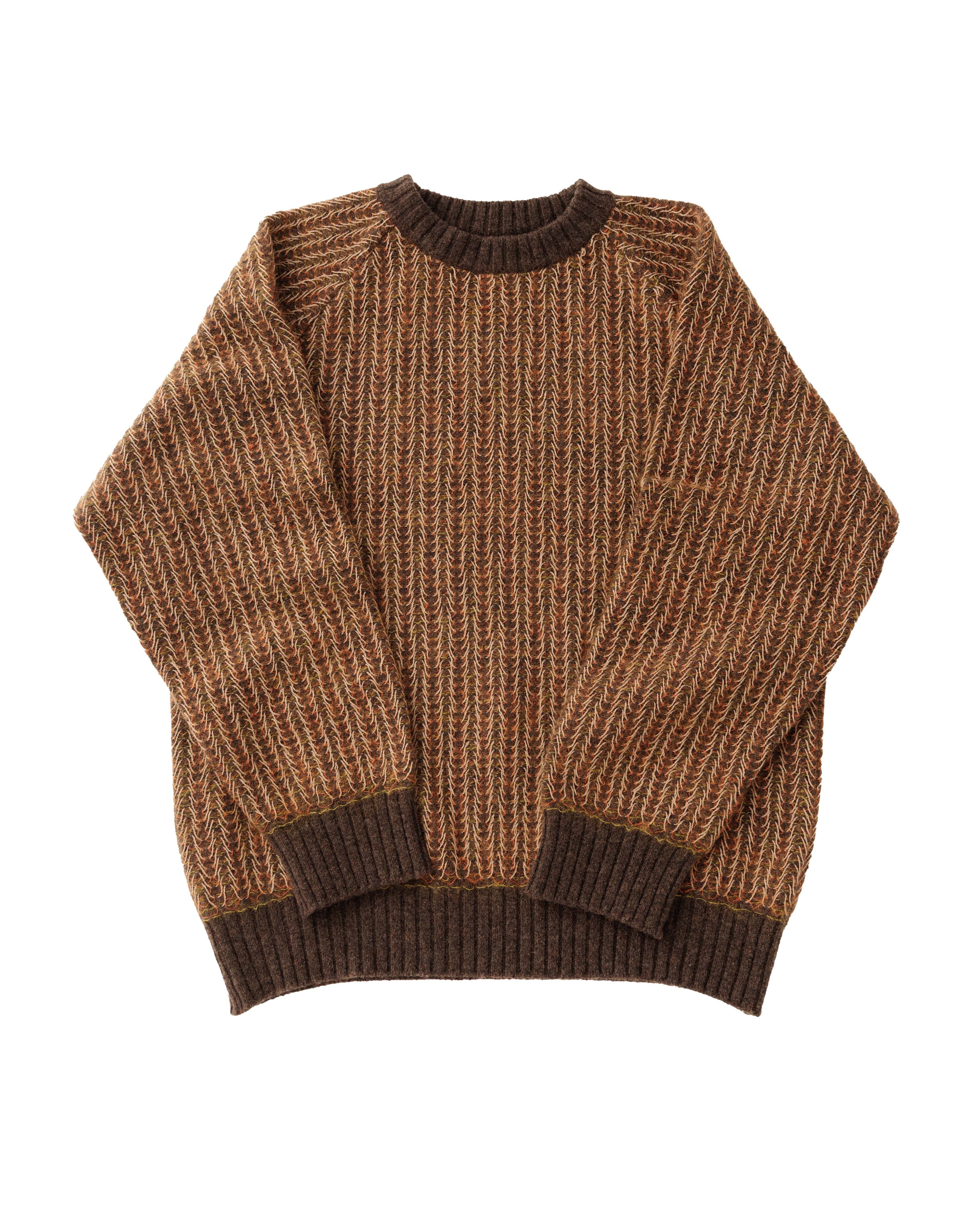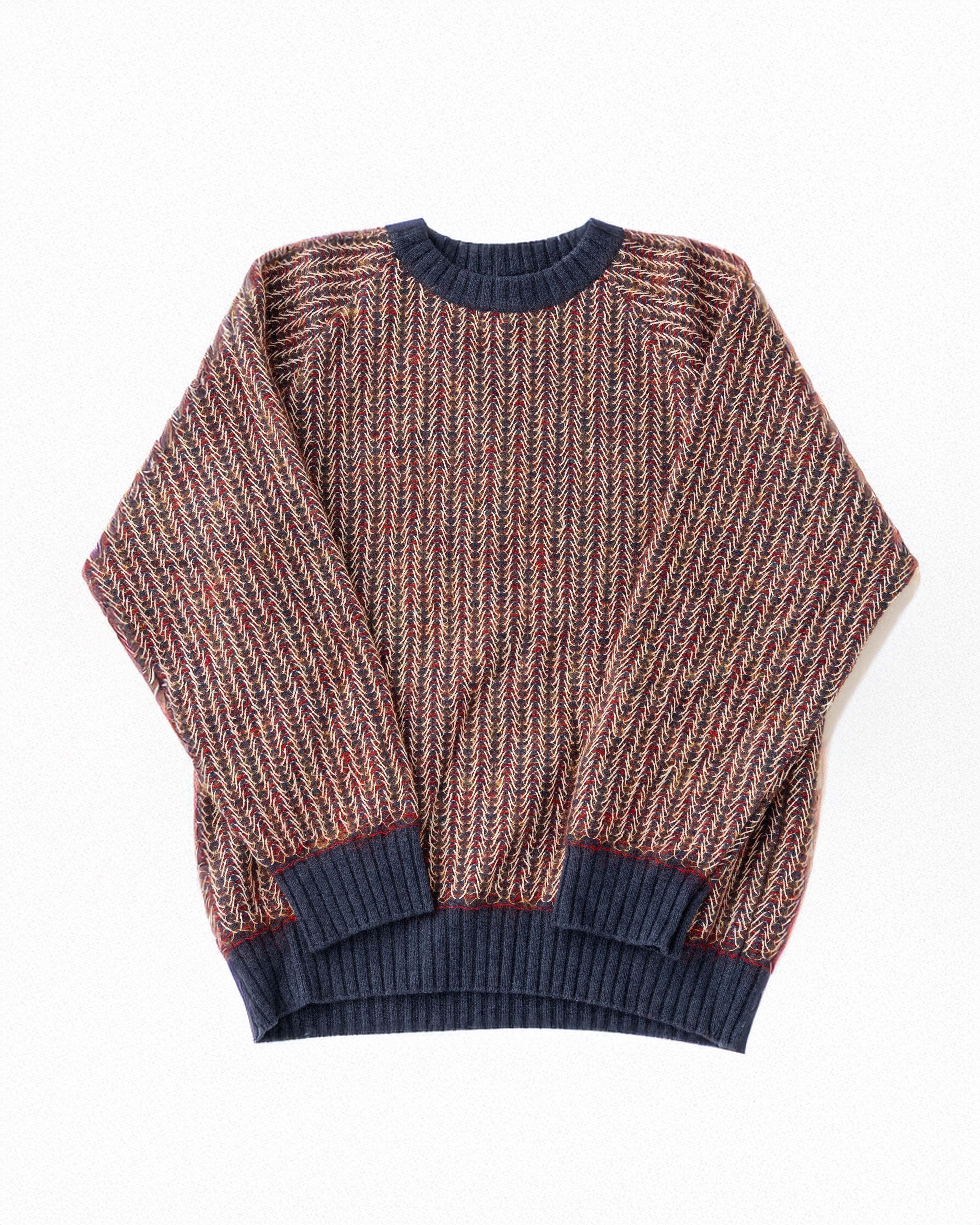 3種類4色の糸が巧妙に絡み合い奥行きのある表情を生み出した、ハ刺し編みのニット。